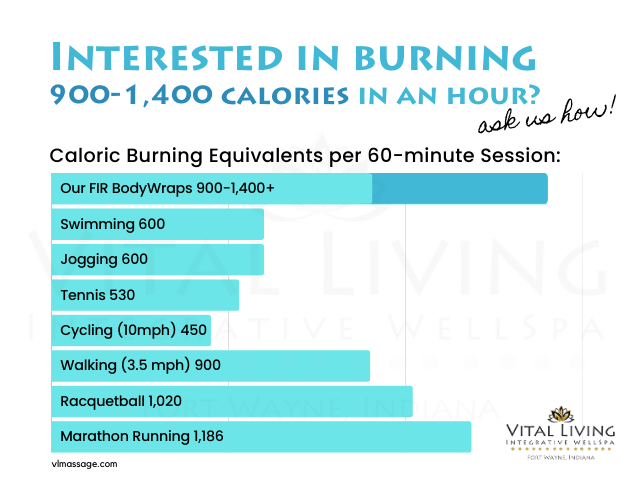 The purpose of the Infrared Body Wrap Treatment is to apply heat to the body in order to get underneath the fat tissue and thin the blood to allow it to get into the areas where fat tissue exists. Bringing the blood back into the areas that have had restricted blood flow causes the metabolism rates to rise. The heat softens the fat tissue causing it to break up and be released into the bloodstream in the form of calories to be burned up as energy. When we have an excess of calories, the body stores them as fat. The Infrared Body Wrap Treatment reverses this process by breaking the fat down into calories and placing them back into the bloodstream to be used as energy. You can burn up to 900 to 1400 calories or more in just one 50-minute Infrared Body Wrap Treatment. Your body will burn off those calories throughout the day.