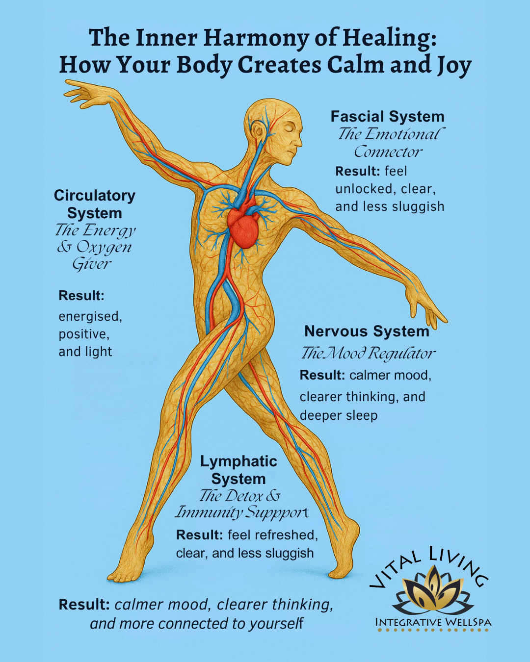 Your nervous system constantly balances between “fight or flight” (stress) and “rest and digest” (calm). When you move, breathe deeply, or receive therapeutic touch, your parasympathetic nervous system switches on — lowering cortisol and inviting peace and relaxation.